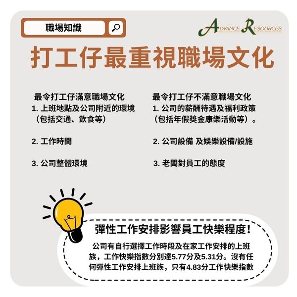 打工仔一日有8小時都要工作,根據CTgoodjobs調查發現受訪香港求職者每周工作時數甚至去到40至49小時 (66%),平均每日工作的時數約8至9.8小時,當中職場文化對打工仔極重要,普遍打工仔都重視佢地嘅上班地點同公司附近環境包括交通、飲食等同工作時間 。